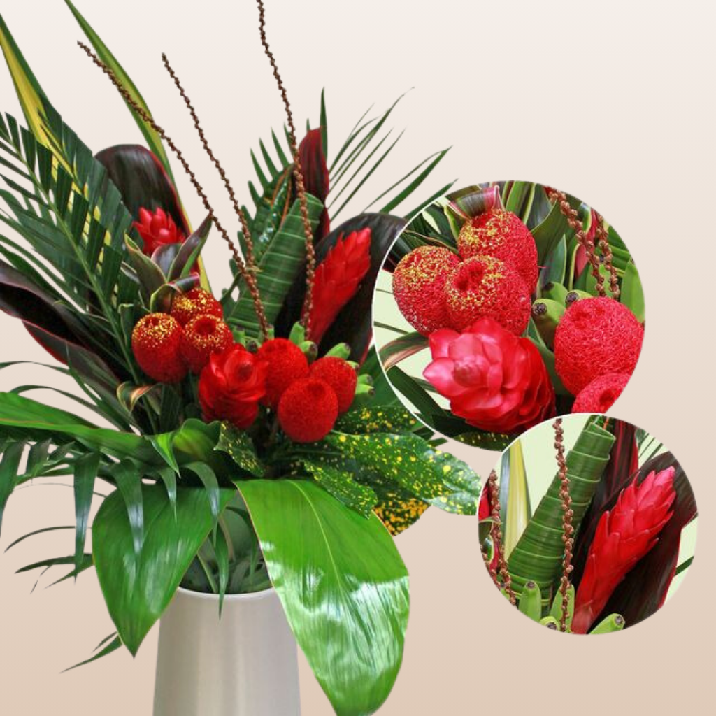 - Arranged in one level with long stem heliconia, ginger and a vast selection of exotic tropical foliage