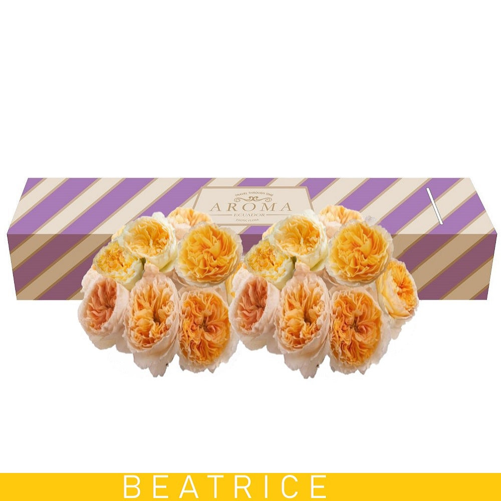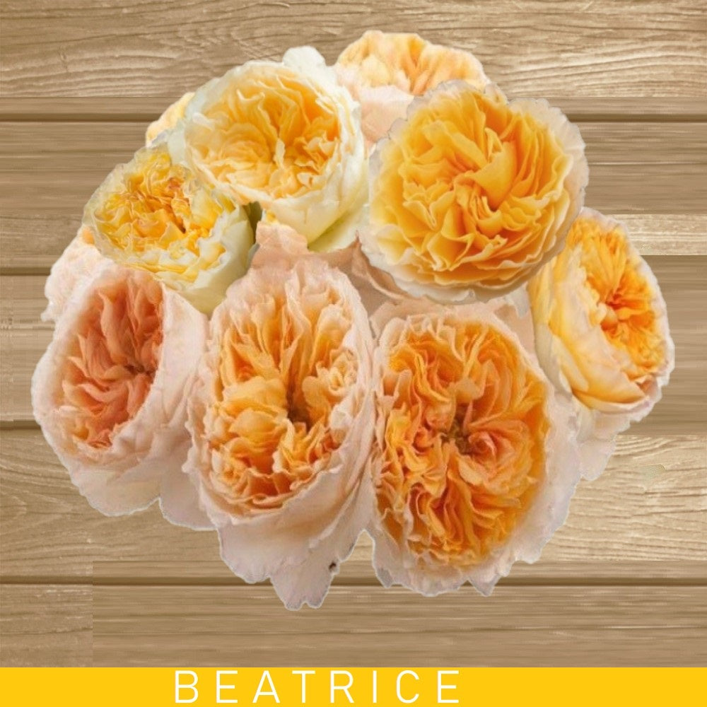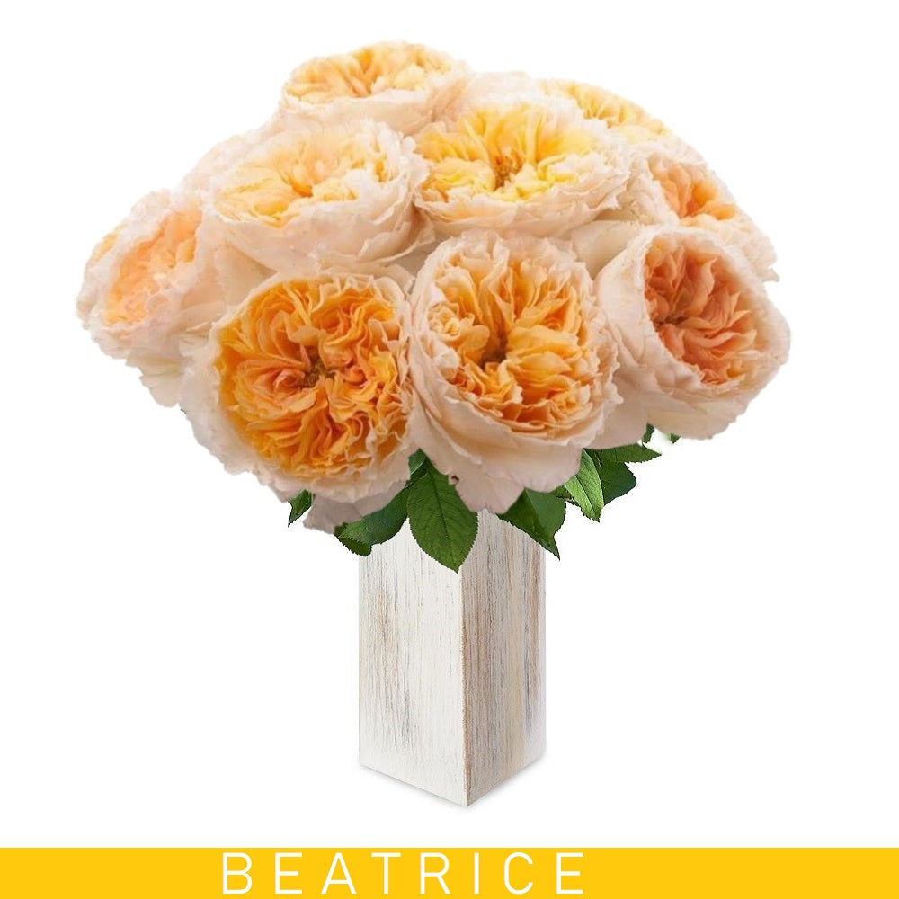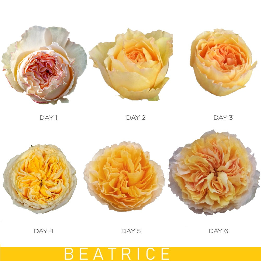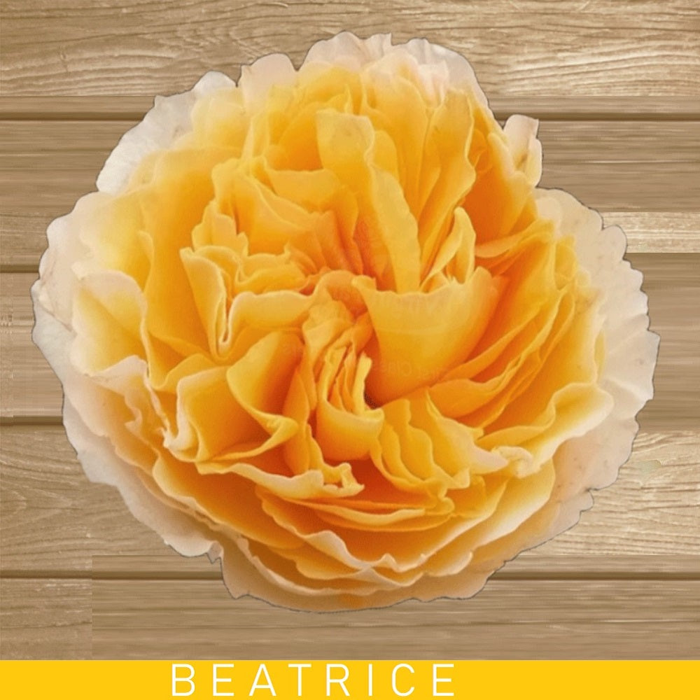 Beatrice Garden Rose Yellow Beatrice’s large blooms are held on strong upright stems. They begin as ruffled cups, opening to classic rosettes with petals radiating from the center of each bloom in a loose swirl, creating a natural garden rose appearance.