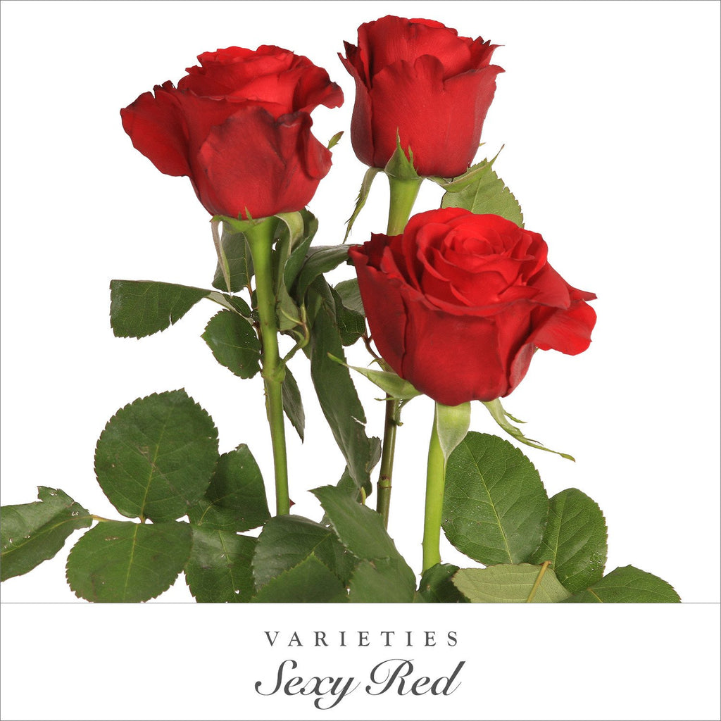 Sexy Red Bulk Red Roses, each flower has a large, cup-shaped bloom. Curvy, ruffled petals showcase a perfect true red hue.